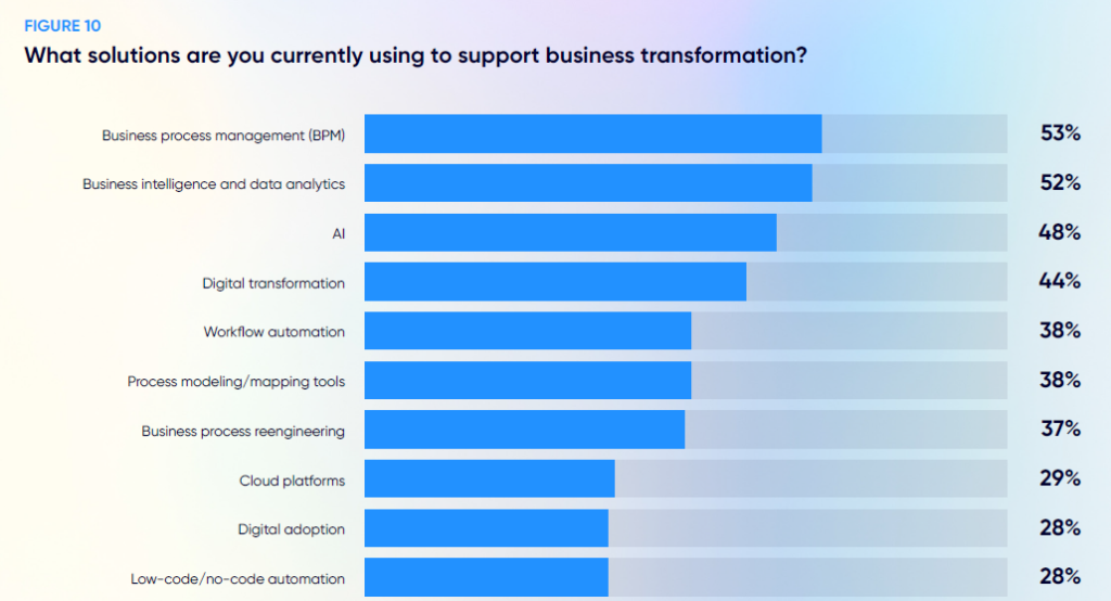 Business process management (BPM) is the leading technology organizations use to support business transformation, cited by 53 percent of respondents.