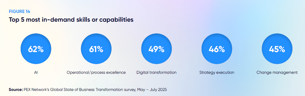 Organizations need more skills in artificial intelligence (AI), operational excellence (OPEX)/process excellence and digital transformation to support business transformation. That’s a key finding from the PEX Report 2025/26, based on the results of a survey of more than 200 professionals.