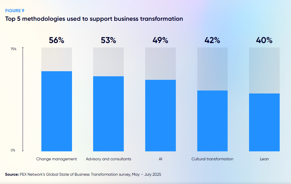 Change management is the leading methodology organizations use to support business transformation. That’s a key finding from the PEX Report 2025/26, based on the results of a survey of more than 200 professionals.