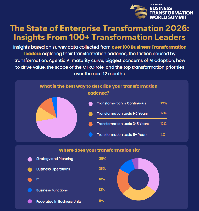 At the Business Transformation World Summit 2026, we surveyed over 100 enterprise transformation leaders to understand how organizations are really navigating transformation today: from cadence and friction points to Agentic AI maturity, value creation, and the evolving scope of the Chief Transformation Officer role.